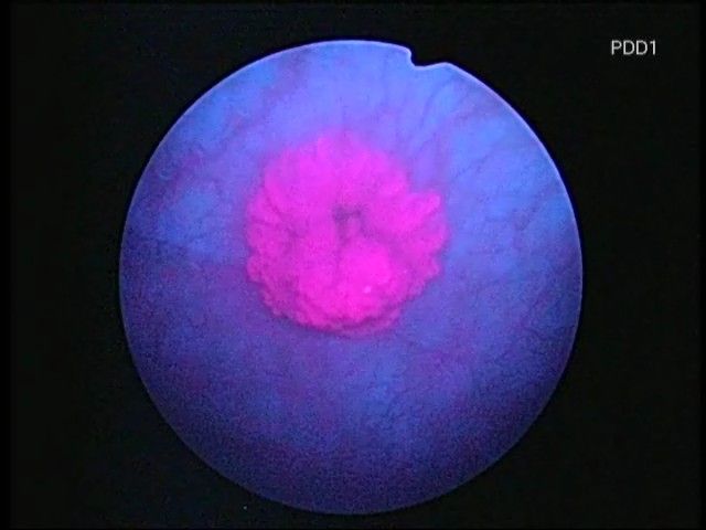 cancer de vessie superficiel vu en lumière bleue et après instillation d’Hexvix